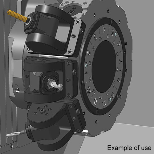 ACHTUNG: dieser Werkzeughalter überschreitet den maximalen sicheren Überhang des Revolvers. Sein Gebrauch bringt daher Einschränkungen und Überschneidungen mit sich, die im Vorhinein in Betracht gezogen werden müssen, um Kollisionen zu vermeiden.