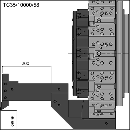 Die Auskragung beträgt 200mm. Somit können Werkstücke mit Ø695 auf 200mm Länge überdreht werden.