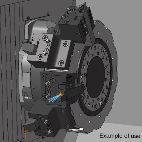 Der Werkzeughalter verfügt über zwei justierbare Kühlmitteldüsen: eine für das rechtsseitige Werkzeug und eine für das linksseitige.