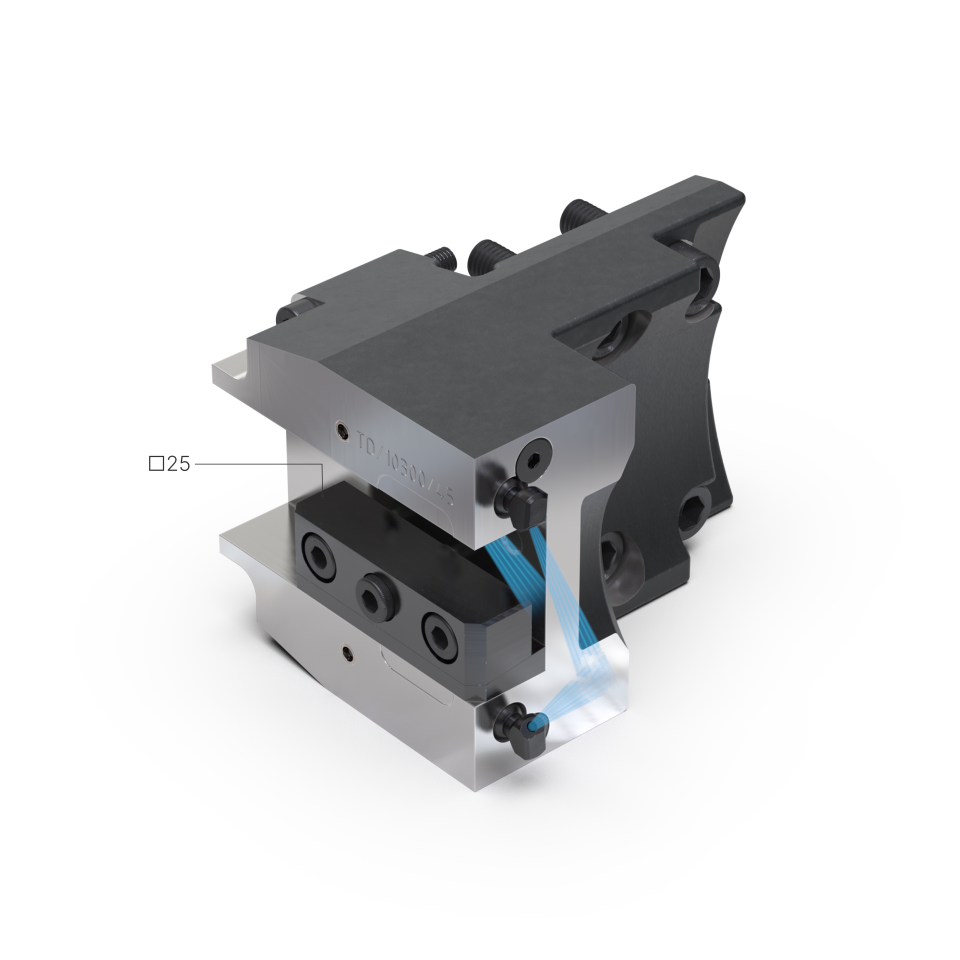 El portaherramientas admite herramientas de exteriores de cuadrado de 25 mm tanto de derechas como de izquierdas. Para ello la cuña y la regla de amarre se pueden montar arriba o abajo.