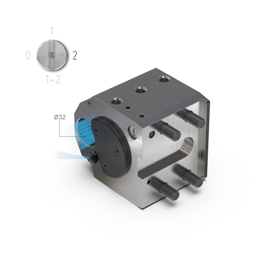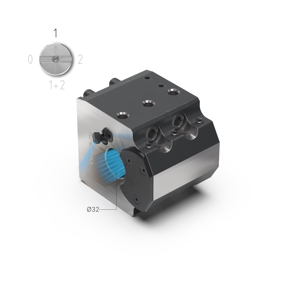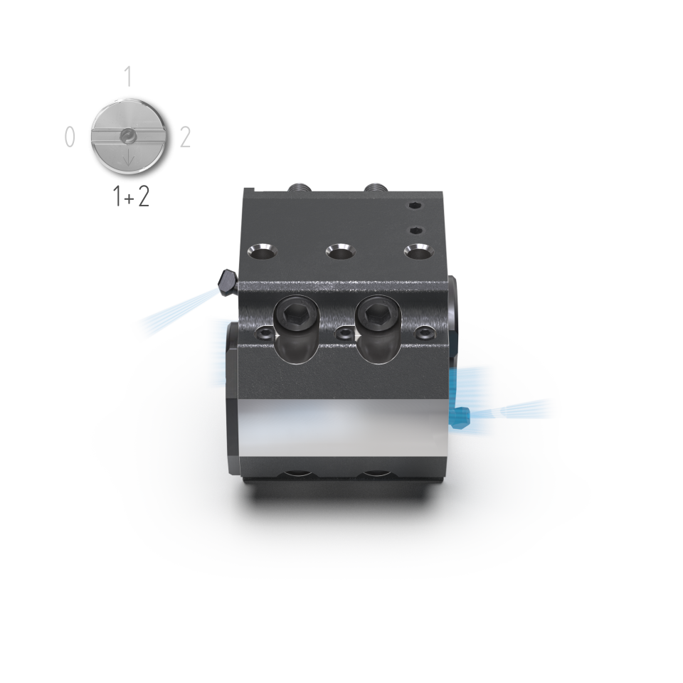 - El portaherramientas admite refrigeración exterior e interior. Mediante una valvula incorporada se selecciona salida de taladrina a un lado (1), al otro (2) o a ambos lados (1+2).