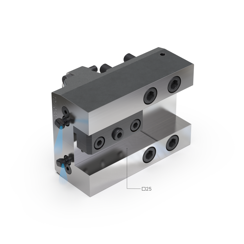 Portaherramientas para montar herramienta de exteriores de cuadrado de 25 mm frontalmente. Sirve para realizar mecanizados frontales, librando el módulo de motorización.