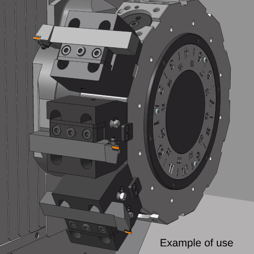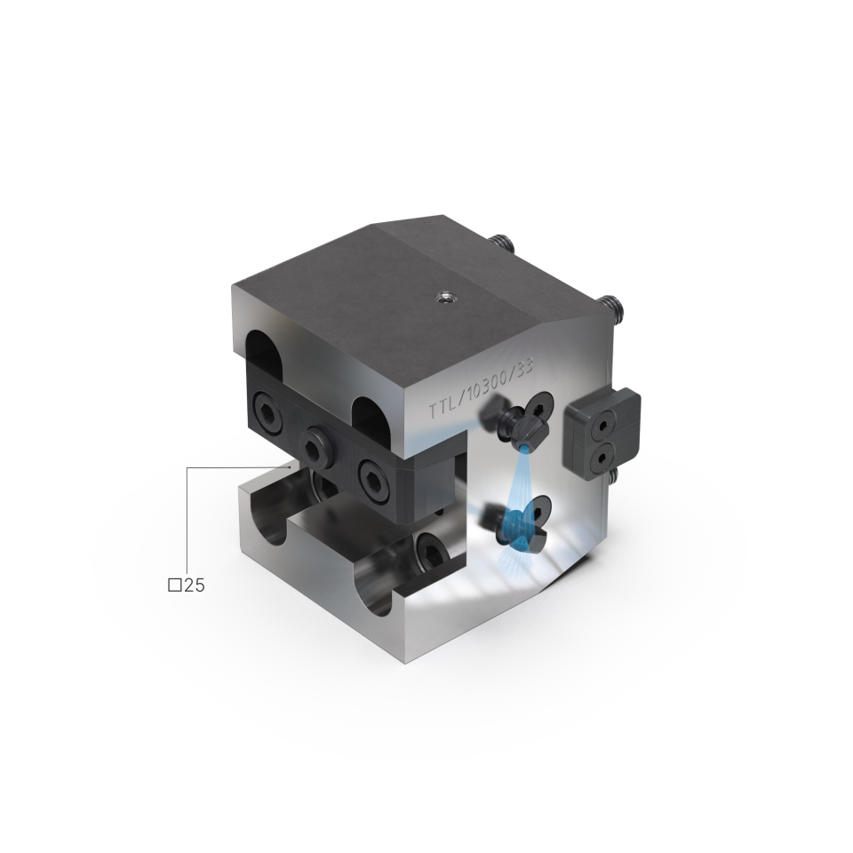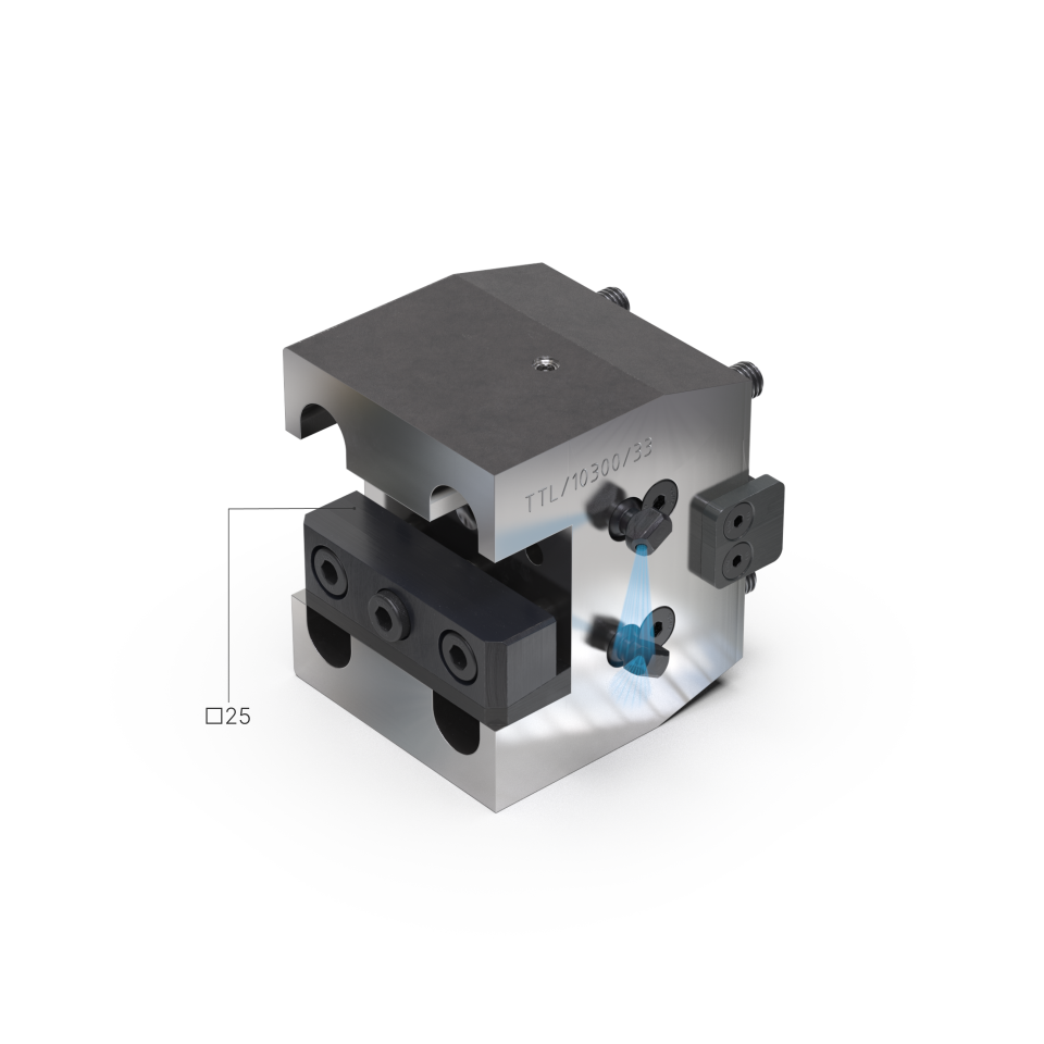 El portaherramientas admite herramientas de exteriores de cuadrado de 25 mm tanto de derechas como de izquierdas. Para ello la cuña y la regla de amarre se pueden montar arriba o abajo.