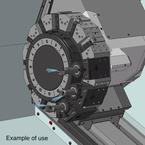 El diseño del portaherramientas permite su montaje en estaciones de torre contiguas. Para el torneado de grandes diametros debe comprobarse que no existen colisiones entre la pieza a tornear y las herramientas montadas en las estaciones adyacentes a la herramienta que se encuentra torneando